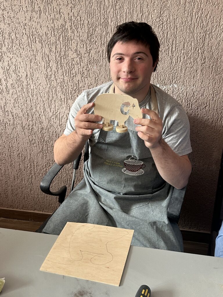 On the basis of the Irakli Kemoklidze Day Center, the wooden workshop “Shkhi” produces environmentally friendly souvenirs and educational toys. Educational toys for reading, mathematics, thinking, Montessori. They can be used in educational, rehabilitation, and medical sessions (among children and adolescents with disabilities and typical development), they are intended for the coordination of hand and finger movements, the development and refinement of motor skills, the formation of grasping and visual motor function, the improvement of abstract thinking and volumetric imagination. The surface of the products is covered with environmentally friendly paint, which is safe for the child’s health.