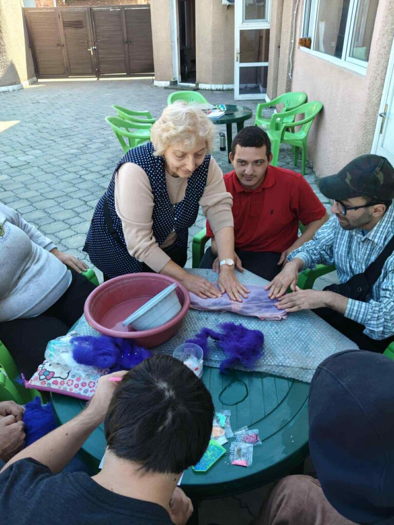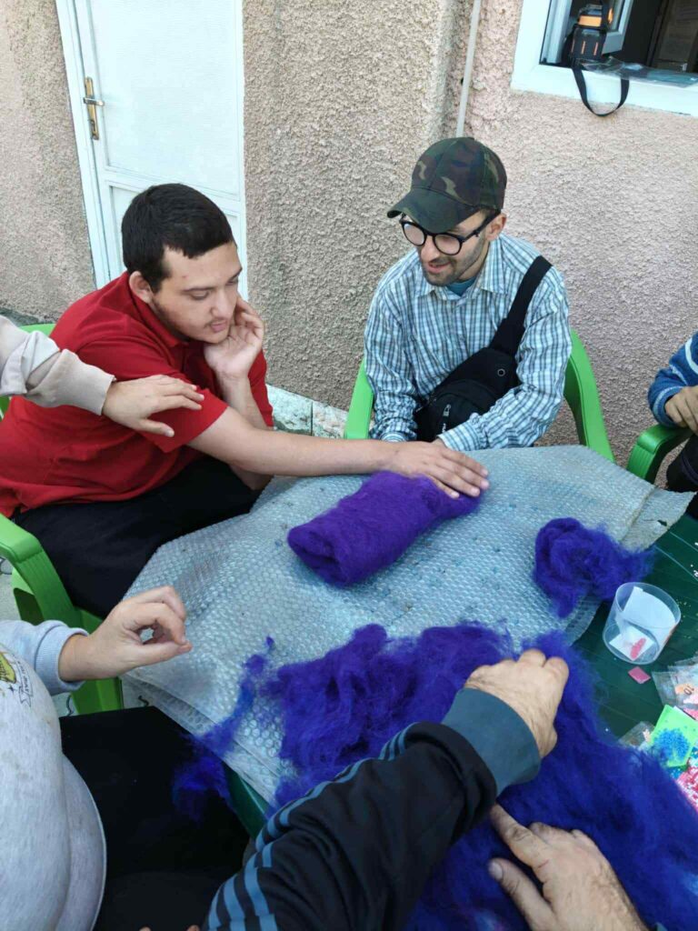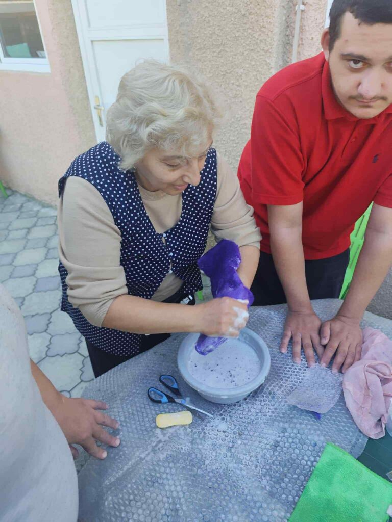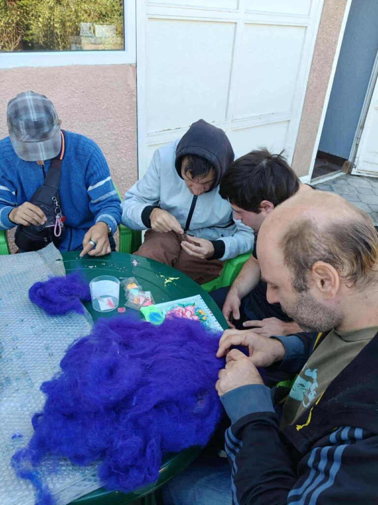 მატყლის სველი მოთელვის ტექნოლოგიის შესწავლა შშმ პირებისთვის ძალიან მნიშვნელოვანი დამრავალმხრივ სასარგებლოა ირაკლი ქემოკლიძის სახელობის დღის ცენტრში ხელოვნებითი თერაპიის სესიაზე, ცენტრის ღია სივრცეში შშმ ახალგაზრდებს ჩაუტარათ სესია-მატყლის სველი მოთელვის ტექნოლოგია და მატყლისგან მობილური ტელეფონის ჩასადების შექმნა.რა არის სველიმოთელვა?ეს არის ხელოვნებისა და ხელსაქმისტექნიკა, როცა მატყლი სპეციალური მეთოდით — წყლის, სარეცხის საპნისა და ხელის მოძრაობისდახმარებით —ეწებება და იქმნება მტკიცე ქსოვილი ანსაგანი (მაგალითად, ჩანთა, სათამაშო, ტელეფონისჩასადები და სხვ.).რას უწყოს ხელს მატყლზე მუშაობა?-იგი ხელს უწყობს მოტორული უნარების განვითარებას,სენსორულ სტიმულაციას,კრეატიულობისა და ფანტაზიის უნარის განვითარებას,ყურადღების კონცენტრაციას, ფსიქო-ემოციური მდგომარეობის დასტაბილურებას, სოციალურ ინტეგრაციას. Studying the technology of wet spinning of wool is very important and useful for people with disabilities in many ways During an art therapy session at the Irakli Kemoklidze Day Center, young people with disabilities were given a session in the open space of the center – the technology of wet spinning of wool and the creation of a mobile phone case from wool. What is wet spinning? This is an art and needlework technique, when wool is glued together using a special method – with the help of water, laundry soap and hand movements – and a strong fabric or object is created (for example, a bag, a toy, a phone case, etc.). What does working with wool help with? – It promotes the development of motor skills, sensory stimulation, the development of creativity and imagination, concentration of attention, stabilization of the psycho-emotional state, and social integration.