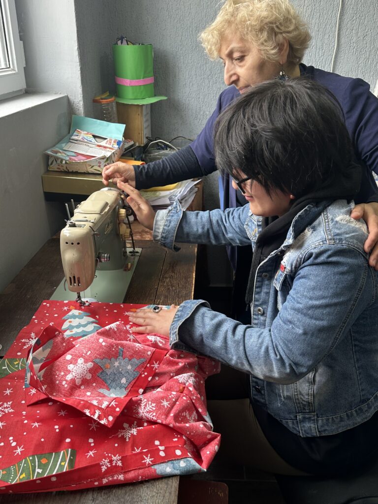 Today, the Irakli Kemoklidze Day Center’s Art Therapy Workshop was dedicated to a practical lesson on sewing a table runner on a sewing machine. Such practical sessions are important for people with disabilities, as they help young people with disabilities