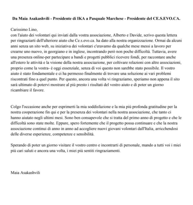 In honor of Irakli, who was an active and valued member of the association, we have initiated a new project called "For You, Irakli." Our goal extends beyond the implementation of the first project, as we are committed to its continual development and strengthening in the upcoming years. We aim to bring more volunteers from Italy to the city of Tbilisi and foster active cooperation with the local authorities, Tbilisi Municipality Hall, and local volunteer associations. Let's work together in organizing meetings, planning new initiatives, projects, and activities. Together, we can achieve great things! Our objective is to build an ideal bridge of solidarity between Italy and Georgia, not only through the exchange of best practices, which we are currently engaged in, but also by working hand in hand to construct a fairer, more united, and inclusive society." - Antonio Fusco.