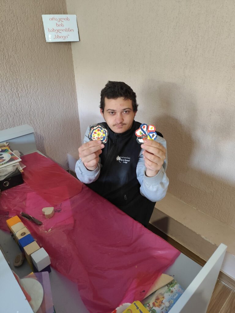 On the basis of the Irakli Kemoklidze Day Center, the wooden workshop “Shkhi” produces environmentally friendly souvenirs and educational toys. Educational toys for reading, mathematics, thinking, Montessori. They can be used in educational, rehabilitation, and medical sessions (among children and adolescents with disabilities and typical development), they are intended for the coordination of hand and finger movements, the development and refinement of motor skills, the formation of grasping and visual motor function, the improvement of abstract thinking and volumetric imagination. The surface of the products is covered with environmentally friendly paint, which is safe for the child’s health.